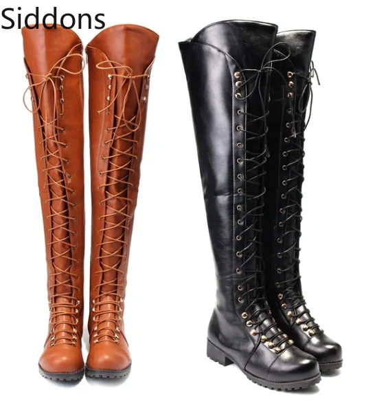 Fashion Women Over The Knee High Boots Lace Up Bandage Gladiator Shoes Thigh High Combat Low Heel Flat Botas Mujer Invierno D08