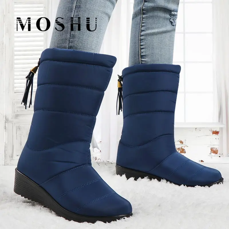 .Gallery of Waterproof Winter Boots Women Ankle Boots Female Tassel Snow Boots Shoes Down Elastic band Wedges Ladies Warm Botas Mujer 2019