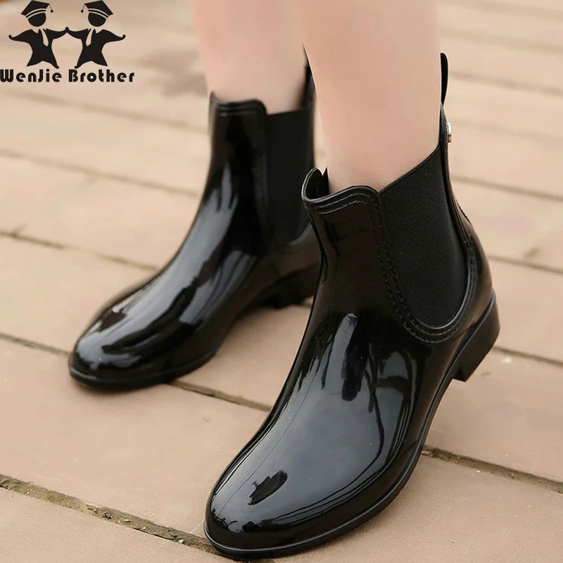 wenjie brother Women Fashion PVC Soft Elastic Band Rainboots Short Ankle Flat Heels Rain Boots Waterproof Water Shoes